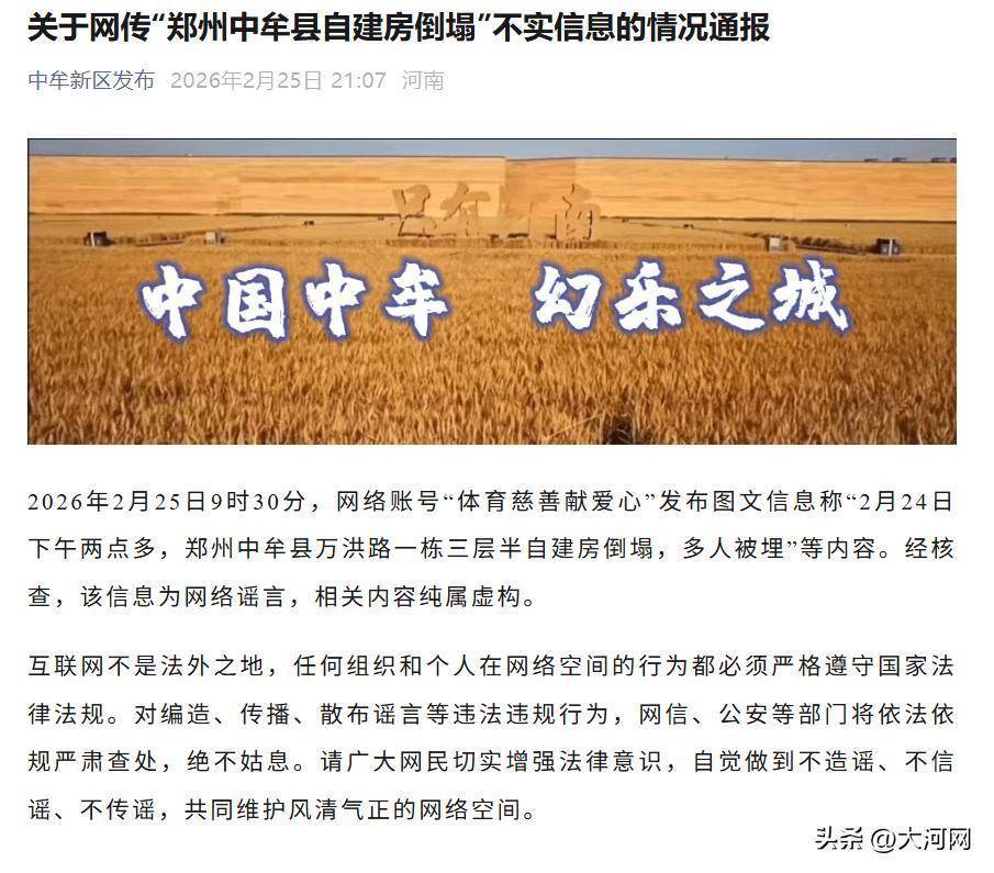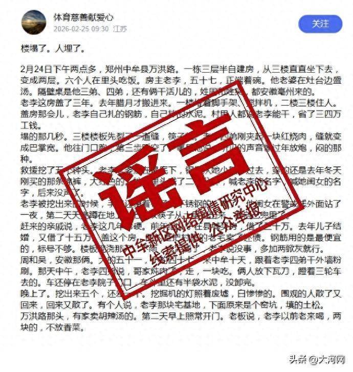 2026年2月25日9时30分,网络账号“体育慈善献爱心”发布图文信息称“2月24日下午两点多,郑州中牟县万洪路一栋三层半自建房倒塌,多人被埋”等内容。经核查,该信息为网络谣言,相关内容纯属虚构。