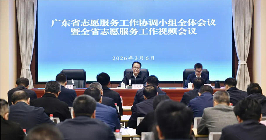 3月6日,广东省志愿服务工作协调小组全体会议暨全省志愿服务工作视频会议在广州召开,深入贯彻落实中办、国办《关于健全新时代志愿服务体系的意见》,认真落实全国社会工作部长会议及全省高质量发展大会等有关部署要求,总结2025年全省志愿服务工作,研究部署2026年重点工作,推动“志愿广东”建设纵深发展,为广东奋进“十五五”凝聚最广泛的社会力量。